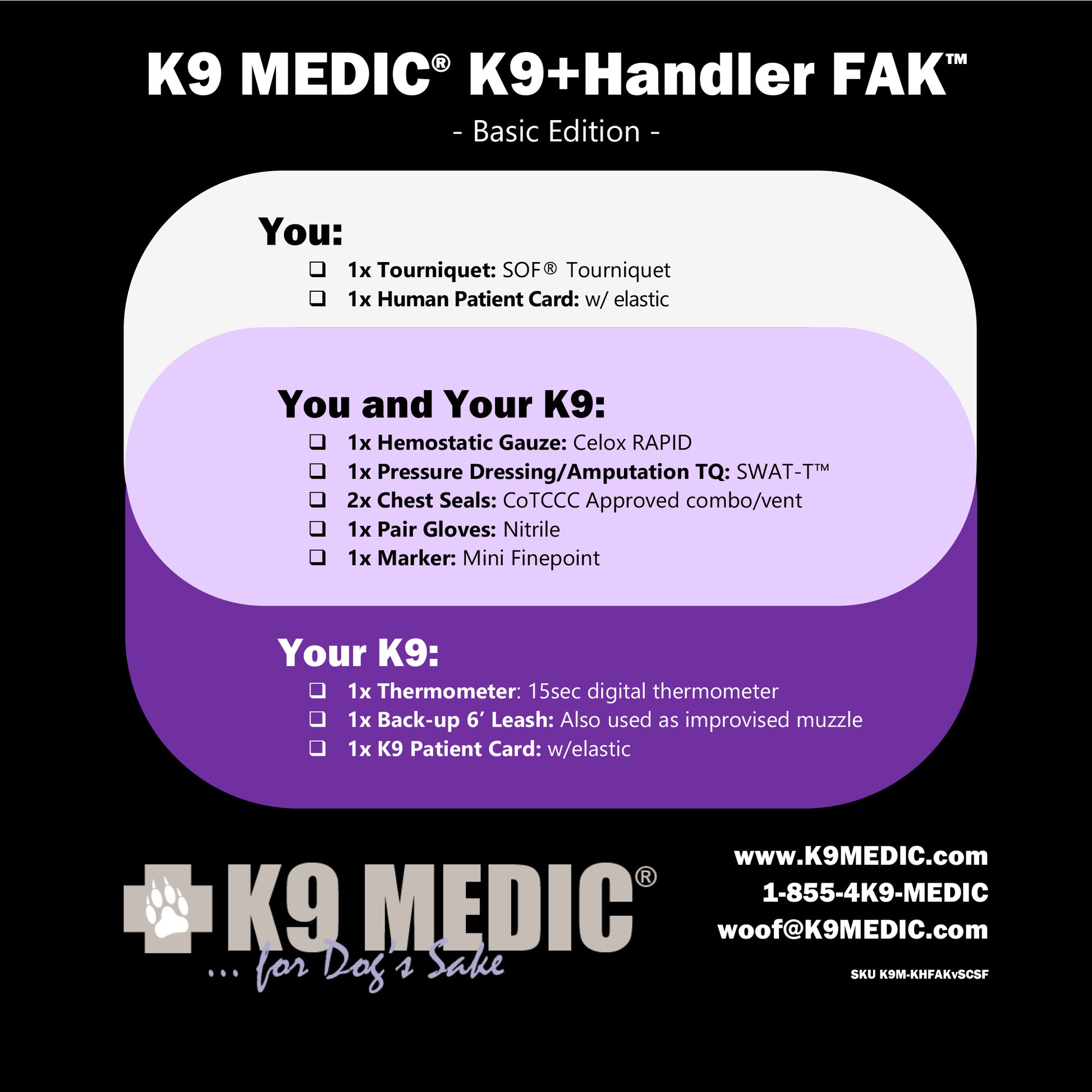 The K9Medic® K9+Handler FAK is a slim, compact trauma kit designed specifically for bleeding control and chest trauma emergencies of both the working K9 and its handler.