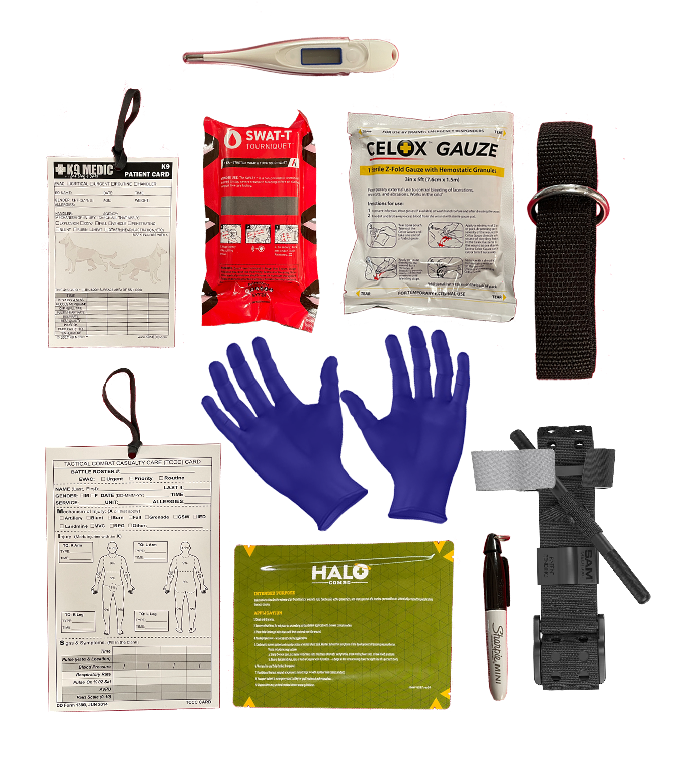 The K9+Handler FAK contains necessary items typically needed for any Law Enforcement Officer to assist in emergency K9 and/or self-care, and are aligned with the Commission on K9TCCC.