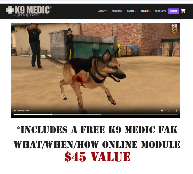 The K9Medic® K9+Handler FAK includes a free, online, training/continuing education module valued at $45.00.